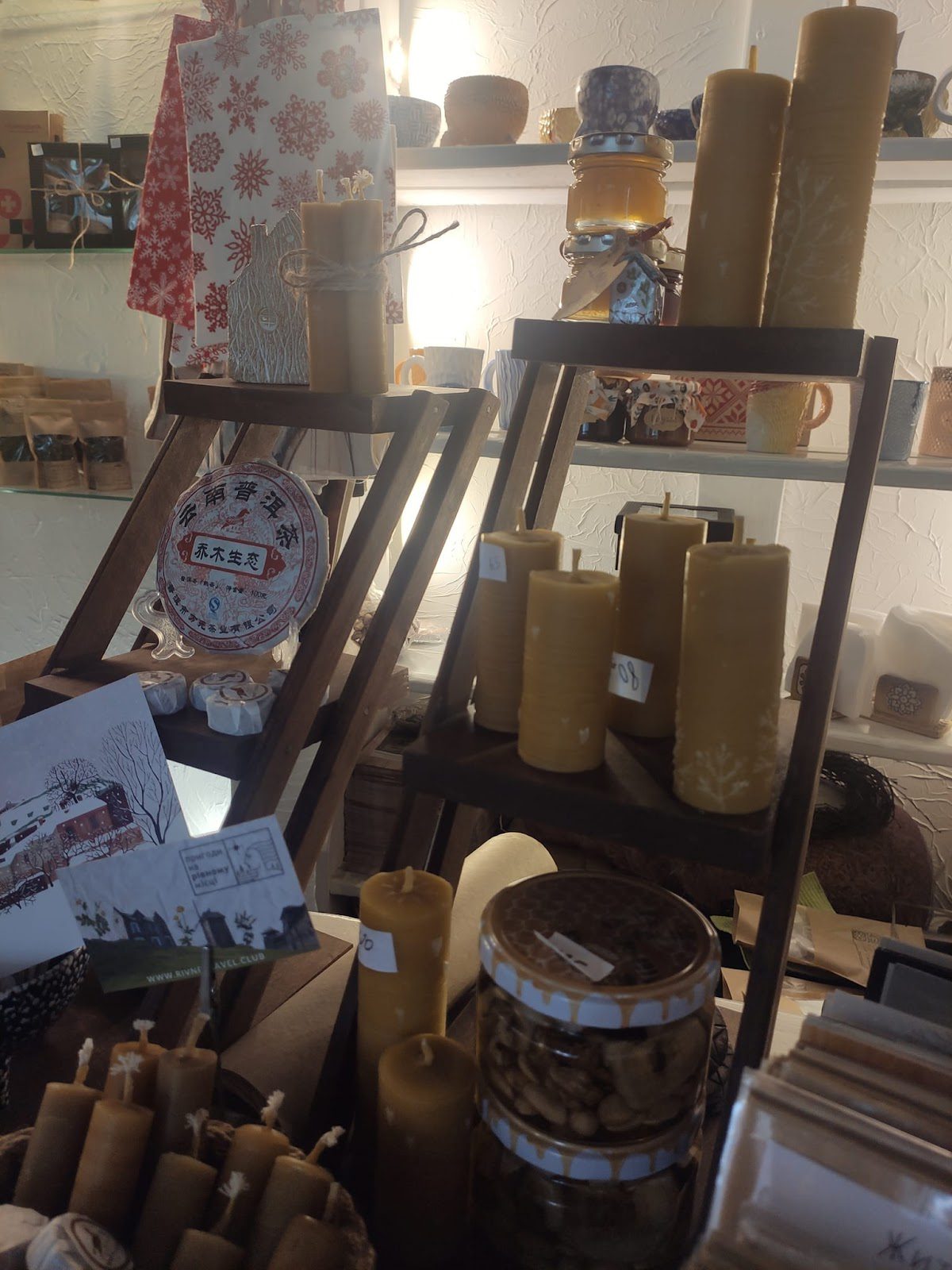 Кроме посуды здесь можно было найти и другую продукцию, идеально подходящую для подарков: медовые свечи, подсвечники, открытки, украшения из натурального камня и настоящих растений, игрушки, блокноты и т.д.