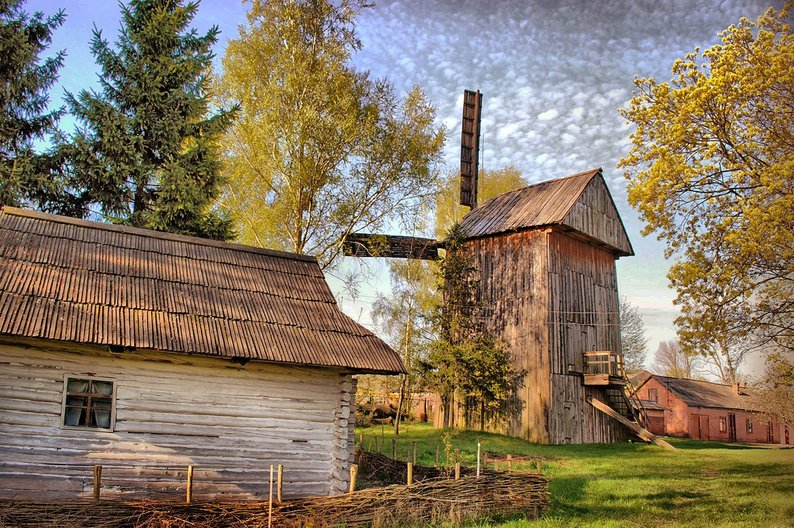 Ветряная мельница, расположенная в скансене в Сарнах, была построена в 1898 году. Она является трехэтажным сооружением 8,4 метра высотой. На первом этаже располагается массивная опора, а на третьем — жернова.