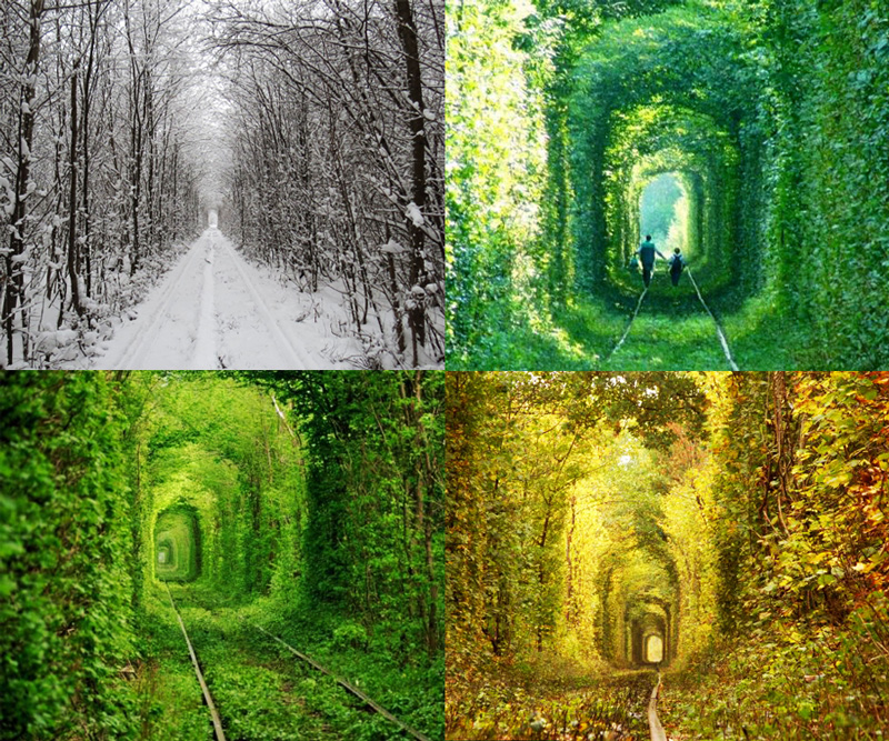 Щодо того, як саме утворився такий собі феномен, то версій є декілька. Згідно з першою, за часів Другої світової війни залізнична одноколійка, яка і зараз простягається крізь увесь Тунель кохання, вела до радянської військової бази. Розуміється, об’єкт секретний, відтак, аби бодай якось замаскувати дорогу, рейки з обох сторін вирішили щільно обсадити деревами та кущами. Так і зробили. У висновку – через роки утворився такий собі зелений коридор відомий сьогодні як Тунель кохання.